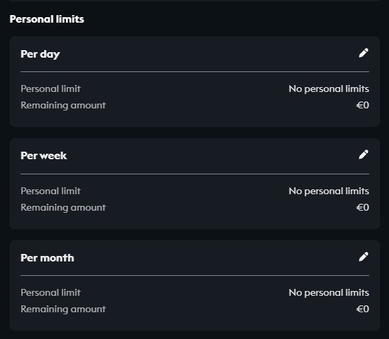 These limits are you own, meaning you set the maximum deposit amount yourself in your settings. There are 3 types of personal limit:
