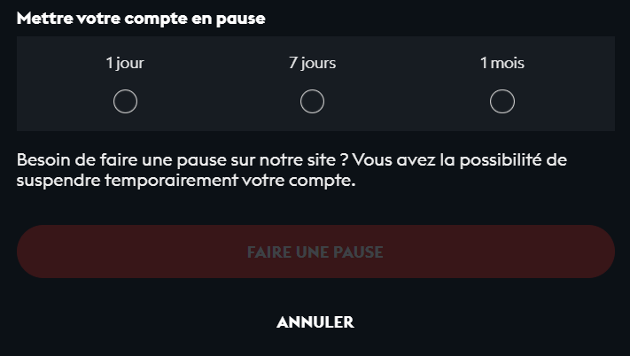 La pause vous permet de bloquer vos accès aux jeux de hasard pour une durée de 1 jour à 1 mois.