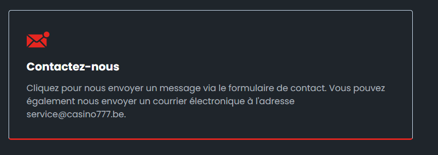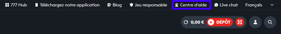 Sur Casino777, rendez-vous dans le menu CENTRE D'AIDE situé en haut à droite de l'écran, puis sélectionnez Contactez nous dans le bas de la page.
