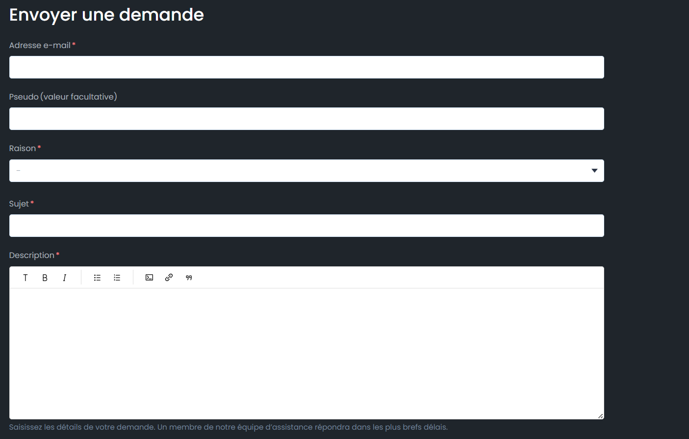 Vous serez alors redirigé vers notre formulaire de contact. Si vous êtes connecté, il vous suffira de sélectionner le sujet dans la liste déroulante et de nous écrire votre question. Si vous n'êtes pas connecté, vous devrez remplir tous les champs manuellement.
