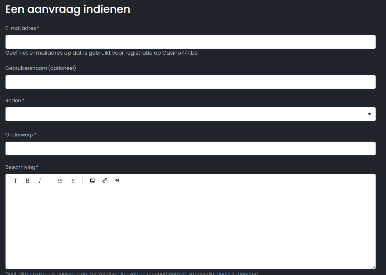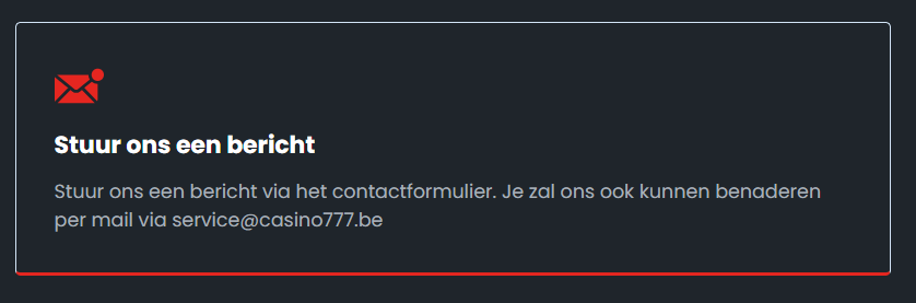 Ga op Casino777 naar het menu Helpcentrum rechts bovenaan het scherm en selecteer Stuur ons een bericht in de keuzelijst.